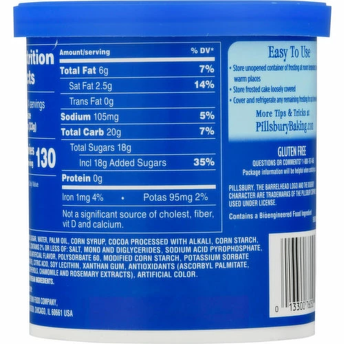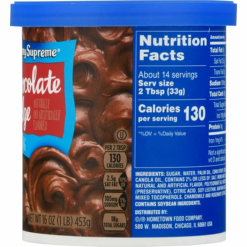 Sugar, Water, Palm Oil, Corn Syrup, Cocoa Processed with Alkali, Corn Starch, Canola Oil, Contains 2% or Less of: Salt, Mono and Diglycerides, Sodium Acid Pyrophosphate, Natural and Artificial Flavor, Polysorbate 60, Modified Corn Starch, Potassium Sorbate (Preservatives), Citric Acid, Soy Lecithin, Xanthan Gum, Antioxidants (Ascorbyl Palmitate, Mixed Tocopherols, Chamomile and Rosemary Extracts), Artificial Color.