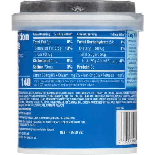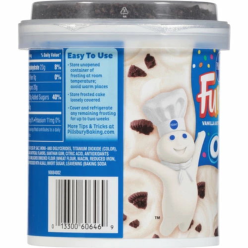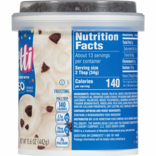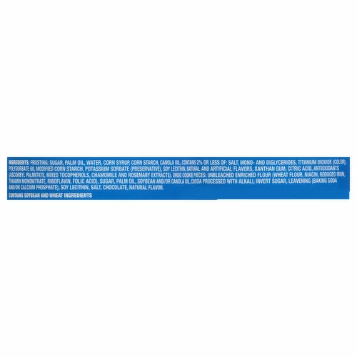 Frosting: Sugar, Palm Oil, Water, Corn Syrup, Corn Starch, Canola Oil, Contains 2% or Less than of: Salt, Mono- and Diglycerides, Titanium Dioxide (Color), Polysorbate 60, Modified Corn Starch, Potassium Sorbate (Preservative), Soy Lecithin, Natural and Artificial Flavors, Xanthan Gum, Citric Acid, Antioxidants (Ascorbyl Palmitate, Mixed Tocopherols, Chamomile and Rosemary Extracts), Oreo Cookie Pieces: Unbleached Enriched Flour (Wheat Flour, Niacin, Reduced Iron, Thiamine Mononitrate, Riboflavin, Folic Acid), Sugar, Palm and/or Canola Oil, Cocoa Processed with Alkali, Invert Sugar, Leavening (Baking Soda and/or Calcium Phosphate), Soy Lecithin, Salt, Chocolate, Natural Flavor.