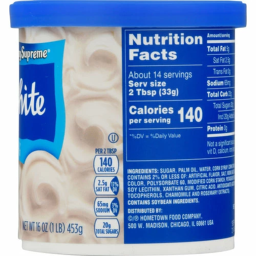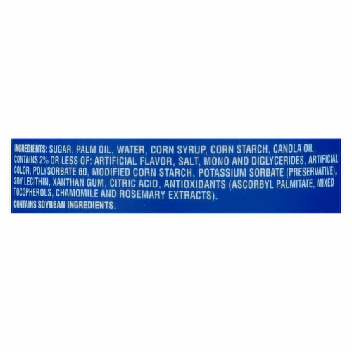 Sugar, Palm Oil, Water, Corn Syrup, Corn Starch, Canola Oil, Contains 2% or Less of: Artificial Flavor, Salt, Mono and Diglycerides, Artificial Color, Polysorbate 60, Modified Corn Starch, Potassium Sorbate (Preservative), Soy Lecithin, Xanthan Gum, Citric Acid, Antioxidants (Ascorbyl Palmitate, Mixed Tocopherols, Chamomile and Rosemary Extracts).