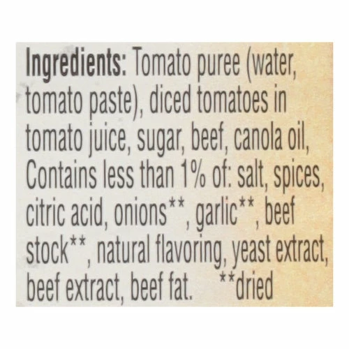 Tomato Puree (Water, Tomato Paste), Diced Tomatoes in Tomato Juice, Sugar, Beef, Canola Oil, Contains Less than 1% of: Salt, Spices, Citric Acid, Onions (Dried), Garlic (Dried), Beef Stock (Dried), Natural Flavoring, Yeast Extract, Beef Extract, Beef Fat.
