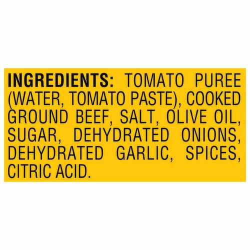 Tomato Puree (Water, Tomato Paste), Cooked Ground Beef, Salt, Olive Oil, Sugar, Dehydrated Onions, Dehydrated Garlic, Spices, Citric Acid.