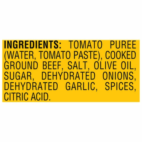 Tomato Puree (Water, Tomato Paste), Cooked Ground Beef, Salt, Olive Oil, Sugar, Dehydrated Onions, Dehydrated Garlic, Spices, Citric Acid.