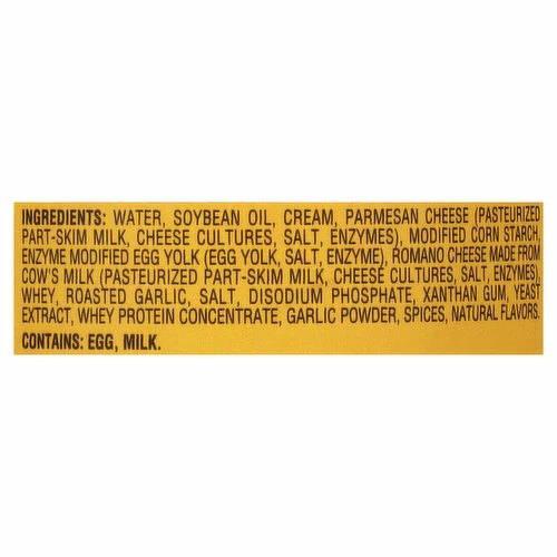 Water, Soybean Oil, Cream, Parmesan Cheese (Pasteurized Part-Skim Milk, Cheese Cultures, Salt, Enzymes), Modified Corn Starch, Enzyme Modified Egg Yolk (Egg Yolk, Salt, Enzyme), Romano Cheese Made from Cow’s Milk (Pasteurized Part-Skim Milk, Cheese Cultures, Salt, Enzymes), Whey, Roasted Garlic, Salt, Disodium Phosphate, Xanthan Gum, Yeast Extract, Whey Protein Concentrate, Garlic Powder, Spices, Natural Flavors.