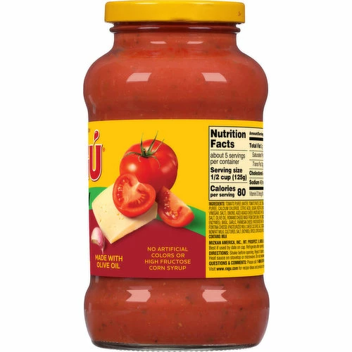 Tomato Puree (Water, Tomato Paste), Diced Tomatoes in Puree (Diced Tomatoes, Tomato Puree, Calcium Chloride, Citric Acid), Sugar, Ricotta Cheese (Pasteurized Milk, Whey, Vinegar, Salt), Onions, Aged Asiago Cheese (Pasteurized Part-Skim Milk, Cheese Cultures, Salt, Enzymes), Salt, Olive Oil, Romano Cheese Made from Cow’s Milk (Pasteurized Part-Skim Milk, Cheese Cultures, Salt, Enzymes), Basil, Garlic, Parmesan (Pasteurized Part-Skim Milk, Cheese Cultures, Salt, Enzymes), Fontina Cheese (Pasteurized Milk, Cheese Cultures, Salt, Enzymes), Mozzarella Cheese (Pasteurized Milk, Nonfat Milk, Cultures, Salt, Enzymes), Spices, Citric Acid, Dried Onions, Natural Flavors.