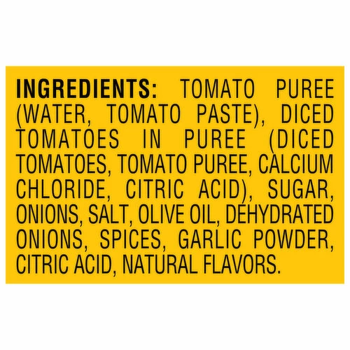 Tomato Puree (Water, Tomato Paste), Diced Tomatoes in Puree (Diced Tomatoes, Tomato Puree, Calcium Chloride, Citric Acid), Sugar, Onions, Salt, Olive Oil, Dehydrated Onions, Spices, Garlic Powder, Citric Acid, Natural Flavors.