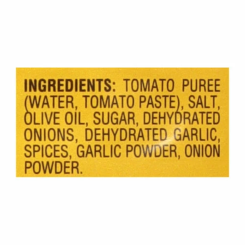 Tomato Puree (Water, Tomato Paste), Salt, Olive Oil, Sugar, Dehydrated Onions, Dehydrated Garlic, Spices, Garlic Powder, Onion Powder.