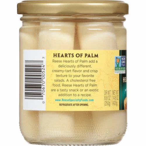 Reese Hearts of Palm add a deliciously different, creamy-tart flavor and crisp texture to your favorite salads. A cholesterol free food, Reese Hearts of Palm are a tasty snack or an exotic addition to a recipe.
