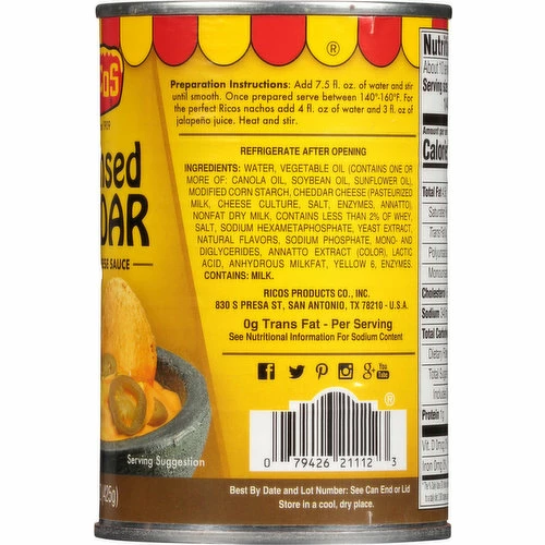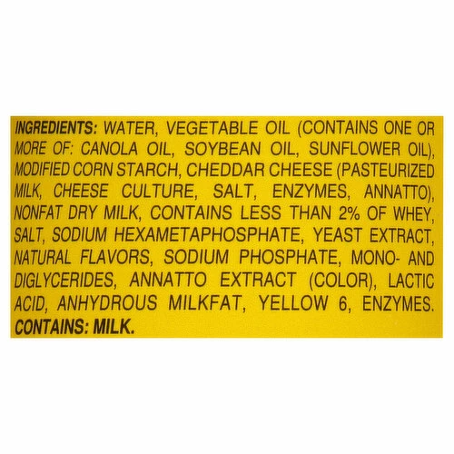 Water, Vegetable Oil (Contains One or More of: Canola Oil, Soybean Oil, Sunflower Oil), Modified Corn Starch, Cheddar Cheese (Pasteurized Milk, Cheese Culture, Salt, Enzymes, Annatto), Nonfat Dry Milk, Contains Less than 2% of Whey, Salt, Sodium Hexametaphosphate, Yeast Extract, Natural Flavors, Sodium Phosphate, Mono- and Diglycerides, Annatto Extract (Color), Lactic Acid, Anhydrous Milkfat, Yellow 6, Enzymes.