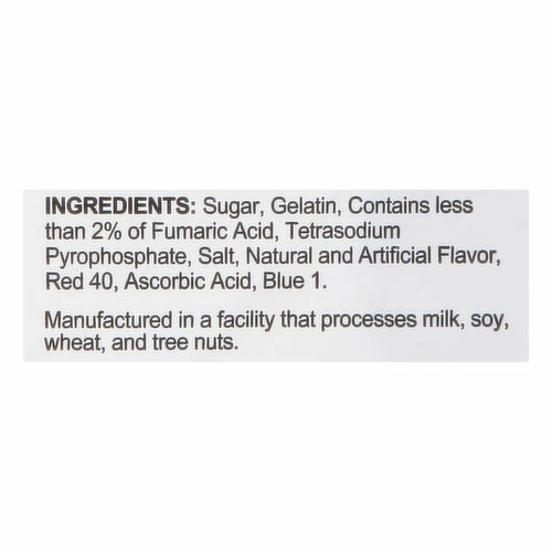 Sugar, Gelatin, Contains Less than 2% of Fumaric Acid, Tetrasodium Pyrophosphate, Salt, Natural and Artificial Flavor, Red 40, Ascorbic Acid, Blue 1.