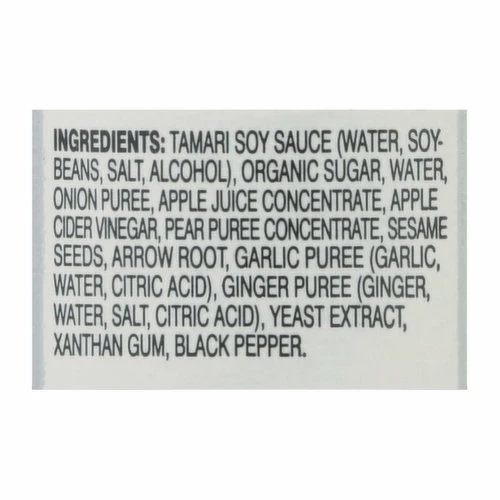 Tamari Soy Sauce (Water, Soybeans, Salt, Alcohol), Organic Sugar, Water, Onion Puree, Apple Juice Concentrate, Apple Cider Vinegar, Pear Puree Concentrate, Sesame Seeds, Arrow Root, Garlic Puree (Garlic, Water, Citric Acid), Ginger Puree (Ginger, Water, Salt, Citric Acid), Yeast, Extract, Xanthan Gum, Black Pepper.
