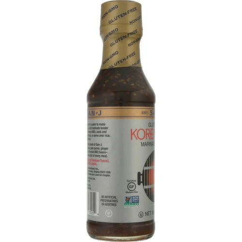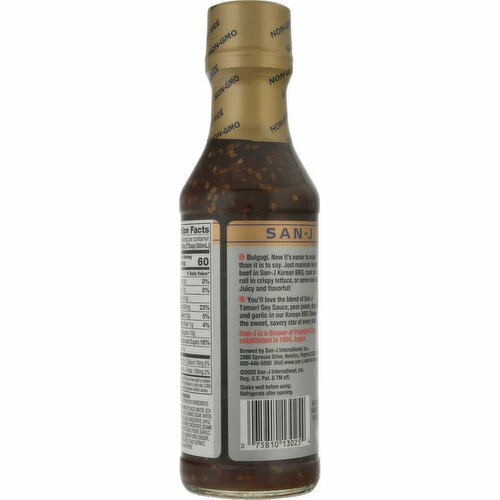 Gluten free. Certified Gluten-Free. Non GMO Project verified. nongmoproject.org. Est. 1804. Bulgogi. Now it’s easier to make than it is to say. Just marinate tender beef in San-J Korean BBQ, cook and roll in crispy lettuce, or serve over rice. Juicy and flavorful! You’ll love the blend of San-J Tamari Soy Sauce, pear puree, ginger and garlic in our Korean BBQ Sauce the sweet, savory star of every meal. San-J is a brewer of premium tamari established in 1804, Japan. No artificial preservatives or additives. Visit www.san-j.com for recipes.