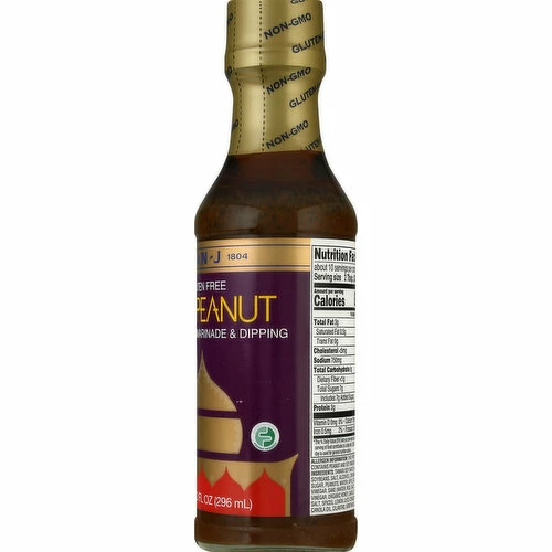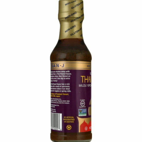 Mildly spicy marinade & dipping. Gluten free. Certified Gluten-Free. Non GMO Project verified. nongmoproject.org. Est. 1804. Create your own chicken satay with the rich taste of San-J Thai Peanut Sauce. Marinate chicken strips, then thread on skewers. Grill or broil, then dip in extra peanut sauce. Yummy! San-J Thai Peanut sauce has a rich taste with a touch of spiciness. Its delicious balance makes it an ideal dipping sauce for veggies or spring rolls. No artificial preservatives or additives. San-J is a Brewer of Premium Tamari, established in 1804, Japan. Foodmap Friendly: Approved food product. www.san-j.com.