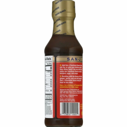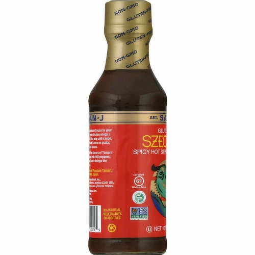 Gluten free. Certified gluten-free. Non GMO Project verified. nongmoproject.org. Est. 1804. Bursting with the flavors or Tamari, ginger, garlic, and red chili peppers, San-J Szechuan Sauce brings the heat to any meal. San-J is a Brewer of Premium Tamari, established in 1804, Japan. No artificial preservatives or additives. Foodmap Friendly: Approved food product. www.san-j.com.
