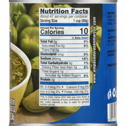 Green Spanish Tomatoes (Tomatillos), Water, Salt, Sugar, Citric Acid, Spices.