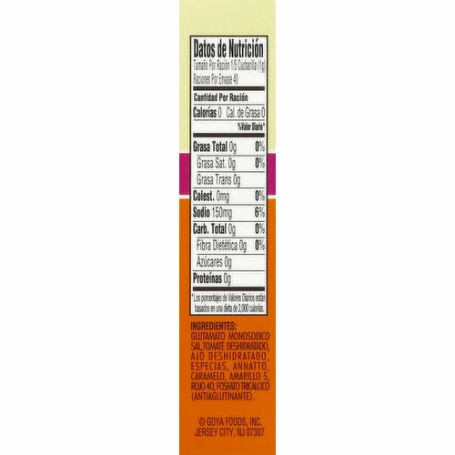 A unique seasoning. Ideal for Mexican rice. Inside this box you’ll find what good cooks have always dreamed of, an absolutely fool proof way to make everything taste not just good, or even great, but sensational – every time. It’s Sazon Goya, a special mix of seasonings from Goya. A little magic in little foil packets. This product will add more flavor and color to your food. Put more flavor into your dishes with Sazon Goya – Just cook the way you always cook, the same recipes, the same seasoning, changing nothing. Except: for every 4 people your recipe serves, just add one packet of Sazon Goya. Two packets for a dish of 8. You’ll wonder how you ever did without it. Use it for meats, stews, soups, poultry, pasta, rice, beans, vegetables – everything. Go to www.goya.com for great recipes using Sazon Goya.