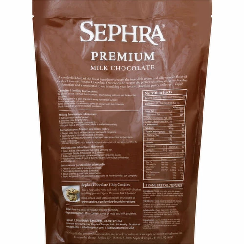 Trans fat & gluten free. World’s finest fondue. A wonderful blend of the finest ingredients creates the incredible aroma and silky smooth flavor of Sephra Gourmet Fondue Chocolate. Our chocolate creates the perfect cascading effect in chocolate fountains and is wonderful to use in making your favorite chocolate pastry or desert. Enjoy! www.sephra.com. The full range of Sephora gourmet fondue chocolate may be ordered online at: www.sephra.com or www.sephraeurope.com to reach us by phone: Sephra L.P. (858) 675-3088. Manufactured in USA.