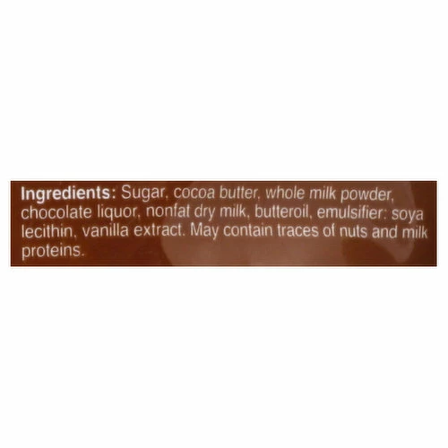 Sugar, Cocoa Butter, Whole Milk Powder, Chocolate Liquor, Nonfat Dry Milk, Butteroil, Emulsifier; Soya Lecithin, Vanilla Extract.