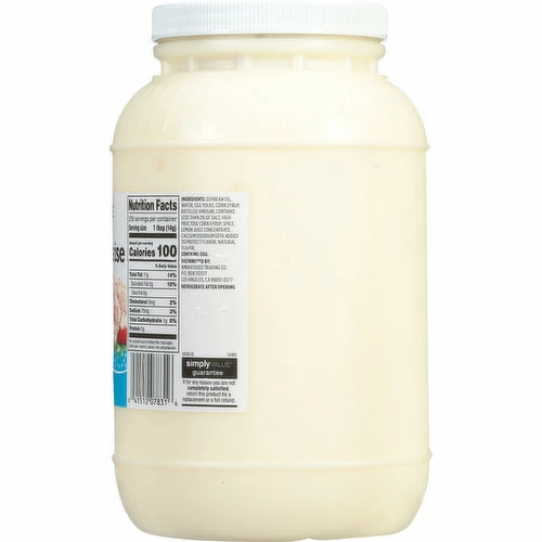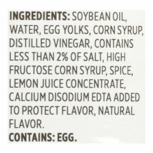 Soybean Oil, Water, Egg Yolks, Corn Syrup, Distilled Vinegar, Contains Less than 2% of Salt, High Fructose Corn Syrup, Spice, Lemon Juice Concentrate, Calcium Disodium EDTA Added to Protect Flavor, Natural Flavor.