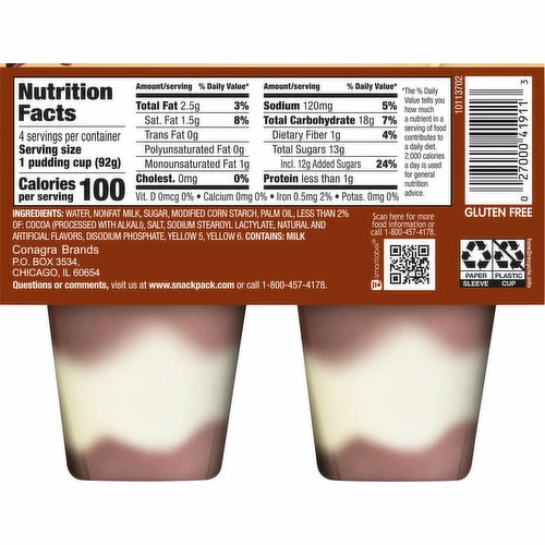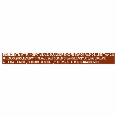 Water, Nonfat Milk, Sugar, Modified Corn Starch, Palm Oil, Less than 2% of: Cocoa (Processed with Alkali), Salt, Sodium Stearoyl Lactylate, Natural and Artificial Flavors, Disodium Phosphate, Yellow 5, Yellow 6.