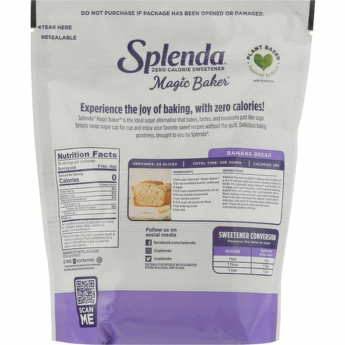 New! The perfect zero sugar baking blend. Perfect for baking; Measures like sugar; Tastes & texture like sugar; Browns like sugar. Experience the joy of baking, with zero calories! Splenda magic bake is the ideal sugar alternative that bakes, tastes, and measures just like sugar. Simply swap sugar cup for cup and enjoy your favorite sweet recipes without the guilt. Delicious baking goodness, brought to you by Splenda. Sweetener Conversion. Measures the same as sugar: 1 tsp sugar; 1 tsp Splenda Magic Baker. 1 tbsp sugar; 1 tbsp Splenda Magic Baker. 1 cup sugar; 1 cup Splenda Magic Baker. The Splenda brand family is the sweetener brand recommended most by healthcare professionals clinically treating patients. Suitable for people with diabetes.