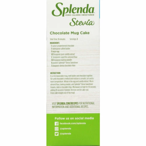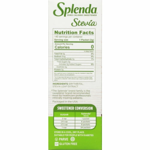 New look! 100% natural. Sweetened by nature with Erythritol. Recommended no. 1 Brand by doctors and dietitians (We know it is important to you where ingredients come from and it’s important to us too. Follow our journey at www.Splenda.com/steviafarms) (The Splenda brand family is the sweetener brand recommended most by healthcare professionals clinically treating patients). Our journey to U.S. grown. You take the time to be healthy. So we are taking the time to grow the best-tasting stevia sweetener. Splenda Stevia Farms. A Division of Heartland Agro US, LLC. A subsidiary of TC Heartland LLC. Splenda Stevia Sweetener is made with two non-GMO sweeteners: Stevia leaf extract and erythritol. Stevia leaves are steeped in water to extract the sweet parts of the leaf and then undergo a process to separate, filter and purify the extract. Erythritol is produced by a fermentation process. Sweetener Conversion: Sugar: 2 tsp: Splenda stevia: 1 Packet; Sugar: 1/4 cup: Splenda stevia: 6 Packets; Sugar: 1/3 cup: Splenda stevia: 8 packets; Sugar: 1 cup: Splenda stevia: 24 packets.