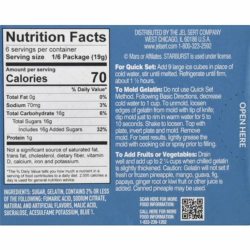 Artificially flavored. 6-1/2 cup servings. New! www.jelsert.com. Scan for more food information. Call here for more food information: 1-833-239-1262.