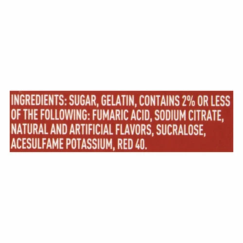 Sugar, Gelatin, Contains 2% or Less of the Following: Fumaric Acid, Sodium Citrate, Natural and Artificial Flavors, Sucralose, Acesulfame Potassium, Red 40.