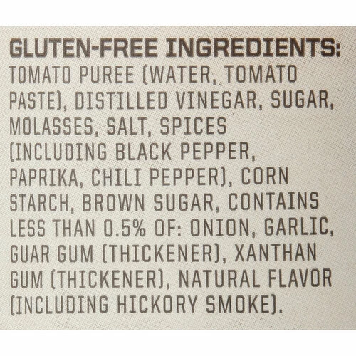 Tomato Puree (Water, Tomato Paste), Distilled Vinegar, Sugar, Molasses, Salt, Spices (Including Black Pepper, Paprika, Chili Pepper), Corn Starch, Brown Sugar, Contains Less than 0.5% of: Onion, Garlic, Guar Gum (Thickener), Xanthan Gum (Thickener), Natural Flavor (Including Hickory Smoke).