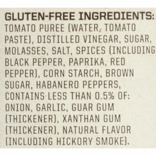 Tomato Puree (Water, Tomato Paste), Distilled Vinegar, Sugar, Molasses, Salt, Spices (Including Black Pepper, Paprika, Red Pepper), Corn Starch, Brown Sugar, Habanero Peppers, Contains Less than 0.5% of Onion, Garlic, Guar Gum (Thickener), Xanthan Gum (Thickener), Natural Flavor (Including Hickory Smoke).