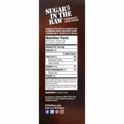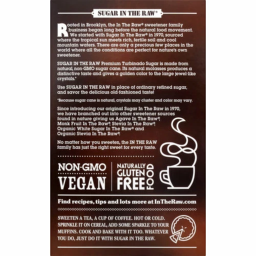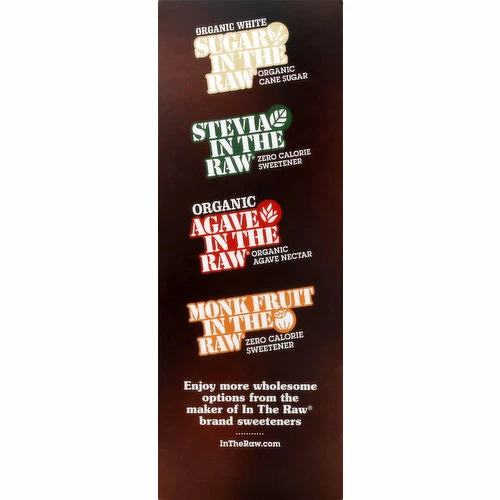 Certified Vegan. vegan.org. Naturally gluten free food. Non GMO Project verified. nongmoproject.org. Rooted in Brooklyn, the In the Raw sweetener family business began long before the natural food movement. We started with Sugar In The Raw in 1970, sourced where the tropical sun meets rich, fertile soil and cool mountain waters. There are only a precious few places in the world where all the conditions are perfect for nature’s own sweetener. Sugar In The Raw Premium Turbinado Sugar is made from natural, non-GMO sugar cane. Its natural molasses produces a distinctive taste and gives a golden color to the large jewel-like crystals (Because sugar cane is natural, crystals may cluster and color may vary). Since introducing our original Sugar In the Raw in 1970, we have branched out into other sweeteners sources found in nature giving us Agave In The Raw, Monk Fruit In The Raw, Stevia in the Raw, Organic White Sugar In The Raw and Organic Stevia In the Raw. No matter how you sweeten, the In The Raw family has just right sweet for every taste. Sweeten a tea, a cup of coffee. Hot or cold. Sprinkle it on cereal, add some sparkle to your muffins. Cook and bake with it too. Whatever you do, just do it with sugar in the raw. InTheRaw.com. Follow us (at)InTheRaw. Facebook. Twitter. Pinterest. Instagram. Find recipes, tips and lots more at InTheRaw.com. For all inquiries, call toll free 1-800-611-7434 or visit InTheRaw.com. Please include best by date and 10 digit UPC number. Organic White Sugar In The Raw. Stevia In The Raw. Organic Agave In The Raw. Monk Fruit In The Raw. Enjoy more wholesome options from the maker of In The Raw brand sweeteners. Packaged from USA.