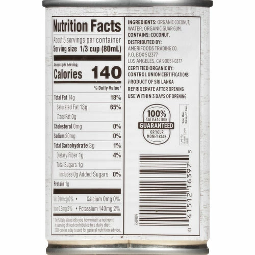 Per 1/3 Cup Serving: 140 calories; 13 g sat fat (65% DV); 20 mg sodium (0% DV); 1 g total sugars. Dairy & soy free. Vegan. Certified Organic by: Control Union Certifications. USDA Organic. Non GMO. 100% satisfaction guaranteed or your money back. Product of Sri Lanka.