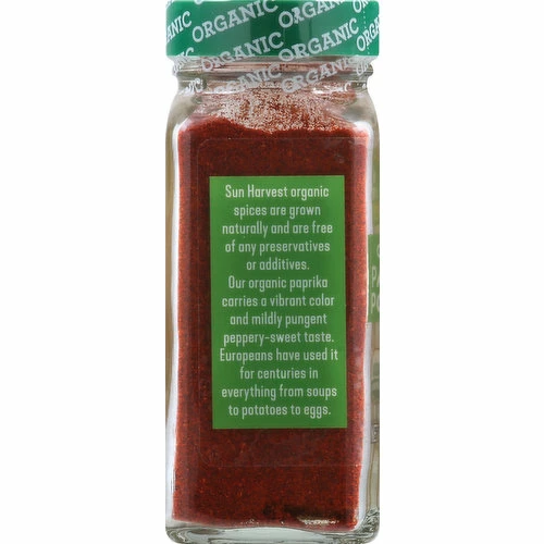 USDA Organic. Certified Organic by: Quality Assurance International. Sun Harvest organic spices are grown naturally and are free of any preservatives or additives. Our organic paprika carries a vibrant color and mildly pungent peppery-sweet taste. Europeans have used it for centuries in everything from soups to potatoes to eggs. 100% satisfaction guaranteed or your money back.