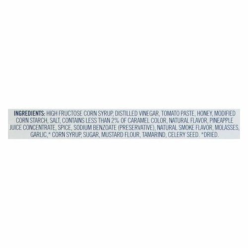 High Fructose Corn Syrup, Distilled Vinegar, Tomato Paste, Honey, Modified Corn Starch, Salt, Contains Less than 2% of Caramel Color, Natural Flavor, Pineapple Juice Concentrate, Spice, Sodium Benzoate (Preservative), Natural Smoke Flavor, Molasses, Garlic (Dried), Corn Syrup, Sugar, Mustard Flour, Tamarind, Celery Seed.
