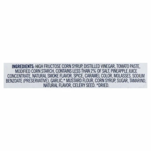 High Fructose Corn Syrup, Distilled Vinegar, Tomato Paste, Modified Corn Starch, Contains Less than 2% of Salt, Pineapple Juice Concentrate, Natural Smoke Flavor, Spice, Caramel Color, Molasses, Sodium Benzoate (Preservative), Garlic (Dried), Mustard Flour, Corn Syrup, Sugar, Tamarind, Natural Flavor, Celery Seed.
