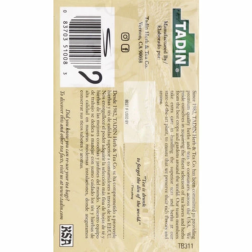 No caffeine. Since 1982. Enjoy our Chamomile Anise Tea. A hint of anise seed goes a long way to boost the already extraordinarily delightful Tadin’s Chamomile Tea. Chamomile Anise Tea features a balanced combination of two soothing flavors that are potent and pleasing to the palate. Tadin’s Chamomile Anise Tea delivers a wonderful sense of relaxation in every flavorful sip that is especially welcomed when your digestion is experiencing unpleasant unrest and needs attention. Since 1982, Tadin Herb & Tea Co. has been committed to providing premium quality herbs and teas to consumers across the USA. We pride ourselves in acquiring the finest selection of tea leaves and herbs from the best crops and gardens around the world. Our team members take extra care in handling the superior teas and herbs at our state-of-the-art plant, to ensure that we preserve their rich flavors and aroma. Tea is drunk to forget the din of the world – T’ien Yiheng. Did you know you can re-use your tea bags? To discover this and other tea facts, visit us at www.tadin.com. Did you know you can also make iced tea with a few bags? To discover this and other tea facts, visit us at www.tadin.com. Instagram. Facebook.