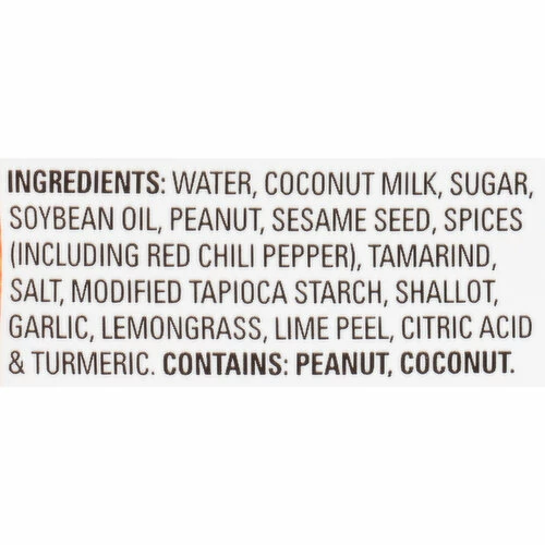 Water, Coconut Milk, Sugar, Soybean Oil, Peanut, Sesame Seed, Spices (Including Red Chili Pepper), Tamarind, Salt, Modified Tapioca Starch, Shallot, Garlic, Lemongrass, Lime Peel, Citric Acid & Turmeric.