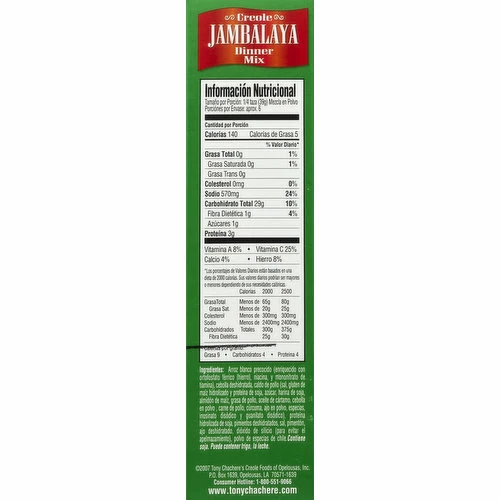Famous Creole cuisine. Microwave or stove top. First Inductee – Louisiana Chefs’ Hall of Fame: South Louisiana cooking legend Tony Chachere makes it easy to enjoy authentic Creole dinners at home. We guarantee the entire family will enjoy this delicious mouthwatering meal. Tony Chachere’s makes everything taste great! For more information about our company, great recipes, and a full list of products, visit us on the web. www.tonychachere.com. Facebook: facebook.com/tonychacheres. Twitter: twitter.com/tonychacheres. Consumer Hotline: 1-800-551-9066. www.tonychachere.com. Please recycle. Made in the USA.