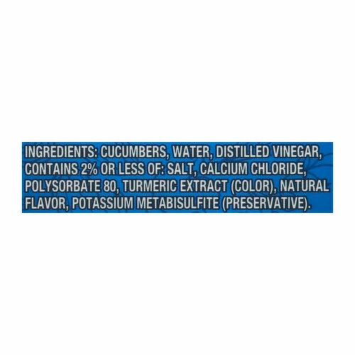Cucumbers, Water, Distilled Vinegar, Contains 2% or Less of: Salt, Calcium Chloride, Polysorbate 80, Turmeric Extract (Color), Natural Flavor, Potassium Metabisulfite (Preservative).