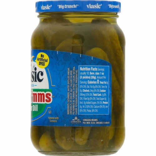 No artificial dyes (Colored with turmeric). Big crunch. That’s one crunchy pickle! Crunchy! No yellow 5.