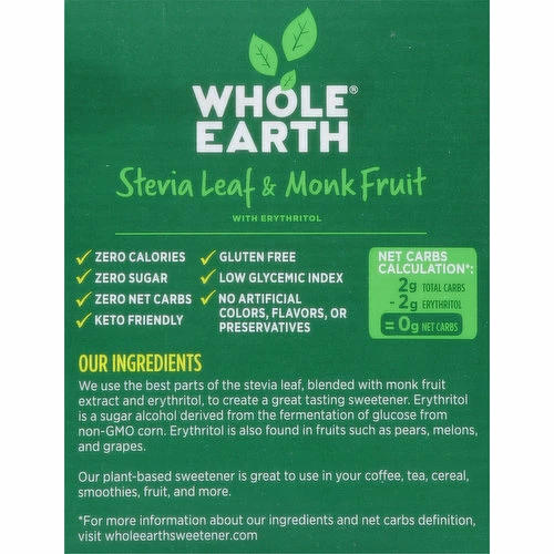 Gluten free. 0 sugars & calories. Non GMO Project verified. nongmoproject.org. Natural (Sweeteners derived from plants and fruit. For more information about our natural standard and ingredients, visit www.wholeearthsweetener.com) sweetener blend. Our great tasting sweetener starts with a great tasting stevia leaf! At Whole Earth, we believe there are better ways to sweet. We’ve crafted this unique blend of nature’s sweet ingredients, including extracts from the best parts of the stevia leaf and monk fruit. Our amazing, non-GMO, zero-calorie sweetener enhances your coffee, tea, cereal, or fruit with a pure, undeniable sweetness that will delight you with the first taste. Live Better. Stevia: The stevia plant is native to the mountain of South America, where it thrives with rich soil, warm sun, and generous rain. We use the best parts of the leaf to create a great tasting alternative to sugar with zero calories. Monk Fruit: This sub-tropical fruit is traditionally grown on the steep, forested mountains of Southern Asia. The vine-ripened melon has been harvested by Buddhist monks for use as a sweetener for nearly 800 years. Erythritol: Our erythritol is sourced from a fermentation process using non-GMO corn. It is similar to the erythritol occuring naturally in fruits like grapes and pears. We are committed to support your journey to live better with lower calorie sweeteners sourced from nature’s wonders. Also try our Whole Earth zero calorie sweetener in a spoonable jar and our other products blended with stevia leaf extract for 50% fewer calories per serving than their traditional counterparts – Raw Cane Sugar Blend, Turbinado Raw Cane Sugar Blend, Organic Honey Blend, and Organic Agave Blend. www.wholeearthsweetener.com. Visit wholeearthsweetener.com to learn more. Environment friendly. Printed with inks containing soy & vegetable oils. Recyclable.