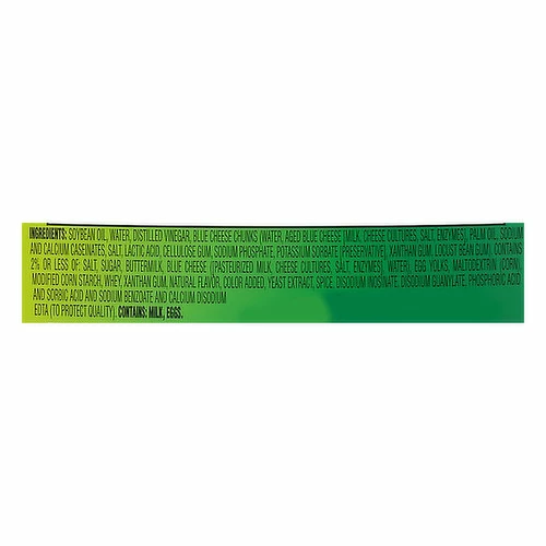 Soybean Oil, Water, Distilled Vinegar, Blue Cheese Chunks (Water, Aged Blue Cheese [Milk, Cheese Cultures, Salt, Enzymes], Palm Oil, Sodium and Calcium Caseinates, Salt, Lactic Acid, Cellulose Gum, Sodium Phosphate, Potassium Sorbate [Preservative], Xanthan Gum, Locust Bean Gum), Contains 2% or Less of: Salt, Sugar, Buttermilk, Blue Cheese ([Pasteurized Milk, Cheese Cultures, Salt, Enzymes], Water), Egg Yolks, Maltodextrin (Corn), Modified Corn Starch, Whey, Xanthan Gum, Natural Flavor, Color Added, Yeast Extract, Spice, Disodium Inosinate, Disodium Guanylate, Phosphoric Acid and Sorbic Acid and Sodium Benzoate and Calcium Disodium EDTA (to Protect Quality).