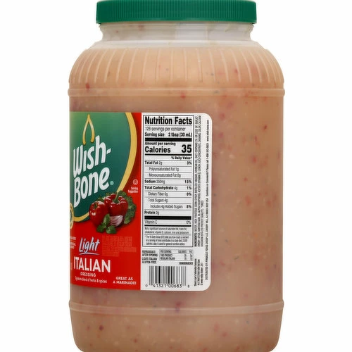 No artificial flavors. Per Serving: This Product: 35 calories; 2 g fat. Per Serving: Regular Italian: 78 calories; 7 g fat. Gluten-free. No MSG added. 50% less calories & 65% less fat than a range of regular Italian dressings. See nutrition information for sodium content. Italian no. 1 dressing brand (Based in part of Information Resources Inc.’s Total US multi-outlet unit sales 52 weeks ending October 1, 2017). Signature blend of herbs & spices. Signature blend of herbs & spices. Great as marinade! www.wish-bone.com. Questions or comments? Please call 1-800-343-9024.