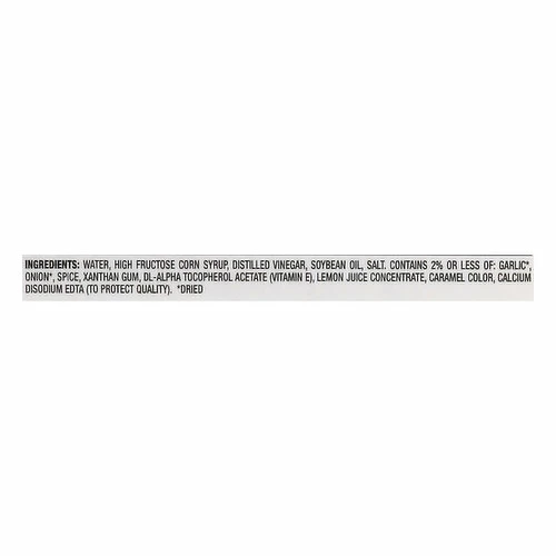 Water, High Fructose Corn Syrup, Distilled Vinegar, Soybean Oil, Salt. Contains 2% or Less of: Garlic (Dried), Onion (Dried), Spice, Xanthan Gum, DL-Alpha Tocopherol Acetate (Vitamin E), Lemon Juice Concentrate, Caramel Color, Calcium Disodium EDTA (to Protect Quality).