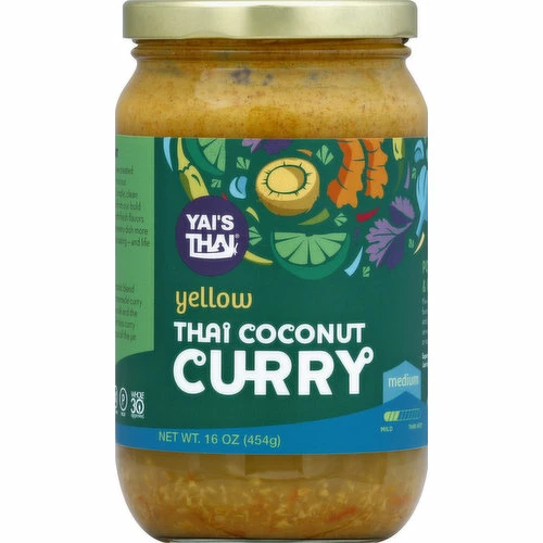 Medium. Never a Bland Moment: We think bland is blah. That’s why we created Yai’s Thai. Our products are born from our enthusiasm for delicious food with simple, clean ingredients. We combined recipes from our bold and fiery Yai (Thai for grandma) with fresh flavors and a bit of American soul to make every dish a bit more exciting. Because for us, that’s what eating – and life – is really all about. (hashtag)neverbland. Yellow Curry: Our classic Yellow Curry is an aromatic blend of Thai spices, starting with our homemade curry paste, mixed with creamy coconut milk and the bright flavor of turmeric for an effortless curry sauce that’s ready to use straight our of the jar. yaisthai.com. (at)yaisthai. 1% for the planet. Non-GMO. Gluten-free. Vegan. Low sodium. Paleo. Whole 30 approved. Recycle.